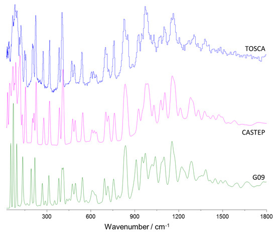 The use of periodic density functional calculations (periodic DFT) to address the vibrational spectra of molecular crystals is becoming increasingly popular [1,2,3,4,5,6,7,8,9,10,11,12]. In fact, the periodic DFT approach, although originally developed to deal with extended inorganic systems, was found to be highly efficient in predicting the vibrational spectra of molecular crystals [13]. Periodic methods—available through programs such as VASP [14], CRYSTAL [15,16] and CASTEP [17]—are often used to assist vibrational assignments of infrared and inelastic neutron scattering (INS) spectra of molecular crystals [1,2,6,7,8,9,18]. Vibrational spectroscopy with neutrons provides information not accessible from the optical techniques (IR and Raman), due to the absence of selection rules. The relationship between periodic DFT calculations and INS spectroscopy is somewhat synergistic. The intensity of INS bands is proportional to the relative atomic displacements in normal modes [19], which, in turn, are a straightforward result of the computational approach to vibrational frequencies. The ability of periodic calculations to predict INS intensities with high accuracy leads to mostly unambiguous assignments of vibrational modes and, additionally, provides the means to test the validity of the molecular model used [6,20].