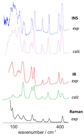 One of the major advantages of INS spectroscopy is to afford rich information in the low wavenumber region, providing a glimpse into the molecular dynamics of the systems. Both large amplitude molecular (internal) modes and crystal lattice collective (external) modes present a strong intensity in the INS spectrum, mainly due to the large displacements of hydrogen atoms. Figure 4 compares the Raman, IR and INS spectra o crystalline 4-phenylbenzaldehyde in the region below 450 cm−1, evidencing the richness of the INS spectrum.