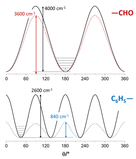 - Godunov, I.A.; Bataev, V.A.; Abramenkov, A.V.; Pupyshev, V.I. The Barriers to Internal Rotation of Benzaldehyde and Benzoyl Fluoride: “Reconciliation{’’} Between Theory and Experiment. J. Phys. Chem. A 2014, 118, 10159–10165. [Google Scholar] [CrossRef]