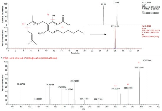 Extracted ion chromatogram (m/z = 373.2384) of CBGMA (cannabigerolic acid methyl ester) and corresponding MS/MS spectra identified exclusively in negative mode.