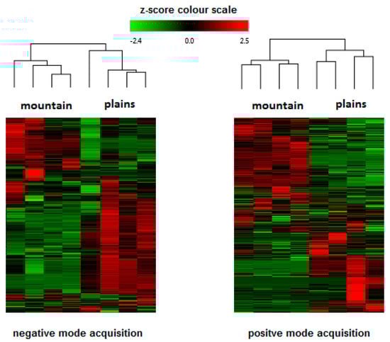 In any case, special attention must be paid to cannaflavins that belong to the class of prenylflavonoids. This flavins are secondary metabolites exclusive to the Cannabis genus and were detected in both environments. Their notable presence in mountain samples points towards alternations in their synthesis [16]. The higher levels detected in the mountain samples may possibly be a consequence of the lower average temperature, combined with high solar radiation experienced at the beginning of plant flowering. In fact, it was reported that different classes of flavonoids are involved in plant protection mechanisms, specifically for their radical scavenger activity and screening ability against short wavelength UV-B light [35].