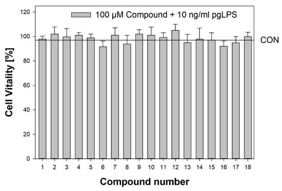 Substances (Table 1) were tested at five concentrations ranging between 1 µM and 100 µM in an in vitro model previously published [28], with the modifications described in the method section. After 6 h of co-incubation with pgLPS and the test compound, IL-8 release was measured in the supernatants, and the calculated percentage change was compared to the inflammatory stimulus pgLPS alone. Cell vitality was determined using an MTT assay upon 6 h incubation of the HGF-1 cells with 10 ng/mL pgLPS and 1–100 µM of each compound. Treated HGF-1 cells did not show any significant reduction of cell vitality compared to the respective solvent control (0.1% DMSO) as shown in Figure 1 for the compounds 1–18 in the highest tested concentration of 100 µM co-incubated with 10 ng/mL pgLPS. Therefore, the effects of the tested compounds measured on IL-8 release are not affected by cytotoxic effects. Graphs for the release of IL-8 after incubation with substances 1 to 18 are part of the supporting information (Figure 4, Figures S2 and S3). Subsequently, the area under the curve (AUC) was calculated for each substance (AUC1,...,18) and categories of substances (AUCmedian) as the sum of trapezoid areas between data points.