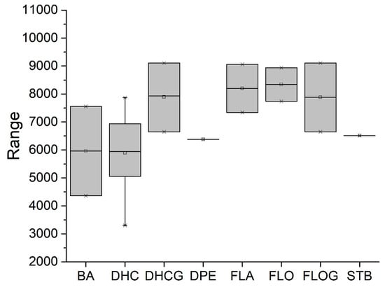 Comparison of the reduction of IL-8 release in pgLPS-stimulated HGF-1 cells among groups of the tested compounds (1 to 18) with different core scaffolds. Depicted are boxplots (min, Q0.25, median, Q0.75, max) of the individual AUCs in the substance groups. Substance groups are N-benzyl-benzamides (BA; n = 2; compounds 13 and 14, AUCmedian = 5928), dihydrochalcones (DHC; n = 7; 6–12, AUCmedian = 5738), dihydrochalcone glycosides (DHCG; n = 3; 1–3, AUCmedian = 7766), diphenylethanone (DPE; n = 1; 17, AUC = 6378), flavans (FLA; n = 2; 15 and 16, AUCmedian = 8090), flavanones (FLO; n = 2; 4 and 5, AUCmedian = 8105), and stilbenoid (ST; n = 1; 18, AUC = 6512).