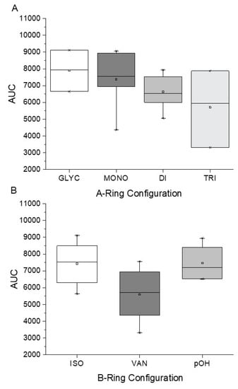 Figure 3A shows that for an IL-8 reducing effect, a trihydroxylated A-ring is preferable (AUCmedian = 5524), as opposed to any other substitution pattern (AUCmedian between 6506 and 7769). Concerning the B-ring functional groups, our data suggest the vanilloyl group to be the most active for an anti-inflammatory effect (Figure 3B), with an AUCmedian = 5464 for the vanilloyl group compared to AUCmedian = 7290 for the isovanilloyl group and AUCmedian = 7385 for the p-hydroxy benzyl moiety.