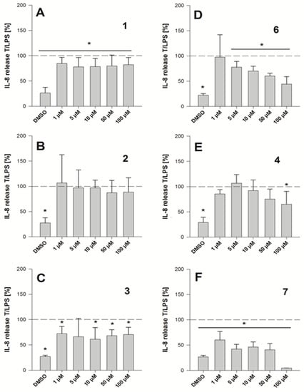 IL-8 release by HGF-1 cells expressed as test over pgLPS control (%) for compounds 1–4, 6, and 7 (A–F) upon 6 h of co-incubation; data are depicted as average ± SD, n = 3–4, technical replicates = 3, *significant differences to pgLPS control (p < 0.05, Student’s t-test).