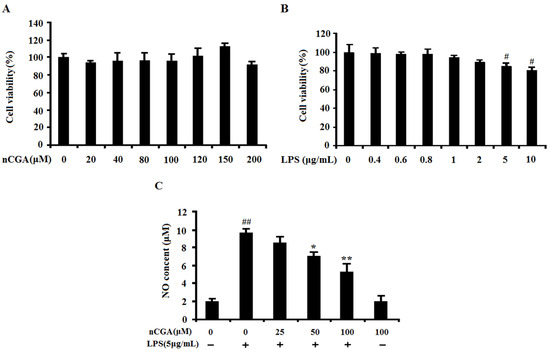 The effects of nCGA and LPS on cell viability were investigated on A549 cells using 3-[4,5-dimehyl-2-thiazolyl]-2,5-diphenyl-2H-tetrazolium bromide (MTT) method. Cells were pretreated with different concentrations of nCGA and LPS for 24 h, and the percentage of cell viability in A549 cells were shown in Figure 1. The result demonstrated that nCGA had no significant effect on A549 cells viability with non-cytotoxic (Figure 1A). In addition, the result also showed that LPS slightly affected cell growth in a dose-dependent manner with low toxicity. To avoid the cytotoxic, the usage of LPS at a concentration of 5 μg/mL was chosen for the best experimental condition (Figure 1B). In addition, nitric oxide (NO), a kind of inflammatory mediator, is expressed only after exposure to pro-inflammatory conditions. As shown in Figure 1C, the results suggested that LPS significantly induced NO production compared with the control group, whereas this result was improved by nCGA treatment. Therefore, these results excluded the possibility that inflammatory responses were caused by the cytotoxicity of nCGA in A549 cells.
