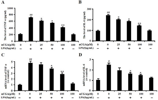 Effects of nCGA on inflammatory cytokines production in Lipopolysaccharide (LPS)-stimulated A549 cells. A549 cells were pretreated with or without various concentrations of nCGA (0, 25, 50, 100 μM) for 2 h before LPS (5 μg/mL) stimulation for another 24 h. (A,B) The levels of TNF-α, IL-6 were detected in the culture medium by ELISA kits. (C,D) The mRNA levels of TNF-α and IL-6 were detected by RT-PCR. The values represent the mean ± SD of three independent experiments, significant differences between different groups. # p < 0.05, ## p < 0.01 vs. control group, * p < 0.05, ** p < 0.01 vs. LPS alone.