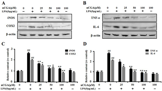 Effects of nCGA on the expression of inflammatory-related proteins in LPS-stimulated A549 cells. Cells were pretreated with or without various concentrations of nCGA (0, 25, 50, 100 μM) for 2 h before LPS (5 μg/mL) stimulation for another 24 h. (A,B) To further demonstrate its anti-inflammatory effects, the proteins of iNOS, COX2, TNF-α, and IL-6 expression were determined by Western blot analysis. (C,D) The quantitative analysis was performed by normalization with β-actin. The values represent the mean ± SD of three independent experiments, significant differences between different groups. #p < 0.05, ## p < 0.01 vs. control group, * p < 0.05, ** p < 0.01 vs. LPS alone.
