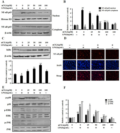 Effects of nCGA on the NF-κB and MAPK signaling pathway in A549 cells. Cells were pretreated with or without various concentrations of nGCA (0, 25, 50, 100 μM) for 2 h before LPS (5 μg/mL) stimulation for another 6 h. (A,B) nCGA inhibited the NF-κB activation, the level of NF-κB p65 in the nucleus and cytoplasm were detected using Western blot analysis. (C) Western blot analysis showed the protein expression levels of IκB. (D) To verify the above results, the expression of the NF-κB p65 subunit in the nucleus was measured using immunofluorescence assay (NF-κB p65 subunit and nuclei were viewed red and blue, respectively). (E,F) The expression of total p38, ERK, JNK, and phosphorylation were detected by Western blot analysis. The values represent the mean ± SD of three independent experiments, significant differences between different groups. # p < 0.05, ## p < 0.01 vs. control group, * p < 0.05, ** p < 0.01 vs. LPS alone, & p < 0.05, nCGA treated group vs. control group.