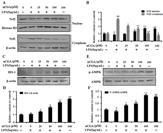 Effects of nCGA on regulation of Nrf2 and AMPK against LPS-induced inflammatory responses in A549 cells. Cells were pretreated with or without various concentrations of nCGA (0, 25, 50, 100 μM) for 2 h before incubation with LPS (5 μg/mL) for another 24 h. (A,B) The nuclear and cytoplasmic Nrf2 were measured by Western blotting and the quantitative analysis were performed by normalization with Histone H3 and β-actin, respectively. (C,D) Western blot analysis showed the protein expression level of HO-1 was normalized with β-actin. (E,F) To investigate the effect of nCGA on AMPK signaling pathway, the level of p-AMPK was determined by Western blot analysis. The values represent the mean ± SD of three independent experiments, significant differences between different groups. # p < 0.05, ## p < 0.01 vs. control group, * p < 0.05, ** p < 0.01 vs. LPS alone, & p < 0.05, && p < 0.01 nCGA treated group vs. control group.