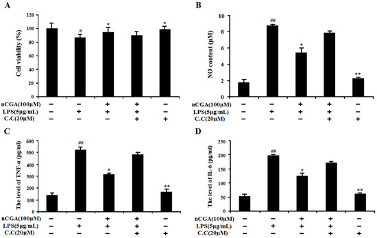 Effect of AMPK activation in the process of nCGA against LPS-induced inflammatory responses. A 549 cells were pre-incubated with presence or absence C.C (20 μM) for 1 h, and then treated with 100 μM nCGA for 2 h before exposure with LPS. (A) The cell viability was detected by MTT assay. (B) NO content. (C,D) The levels of TNF-α and IL-6 were measured by ELISA assay. The values represent the mean ± SD of three independent experiments, significant differences between different groups. # p < 0.05, ## p < 0.01 vs. control group, * p < 0.05, ** p < 0.01 vs. LPS alone.