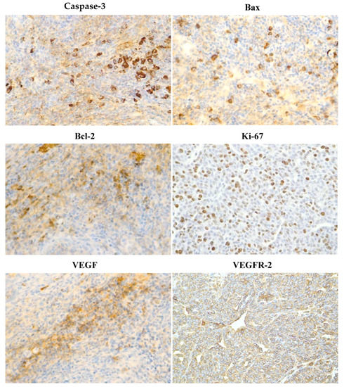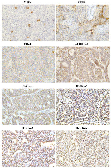 Representative images of expression of caspase-3, Bax, Bcl-2, Ki67, VEGFA, VEGFR-2, MDA, CD24, CD44, ALDH1A1, EpCam, H3K4m3, H3K9m3, H4K20m3, and H4K16ac in rat carcinoma tissue of mammary gland. For detection, polyclonal caspase-3 antibody (Bioss, Woburn, MA, USA), polyclonal Bax and Bcl-2 antibodies (Santa Cruz Biotechnology, Paso Robles, CA, USA), monoclonal Ki67 antibody (Dako, Glostrup, Denmark), monoclonal VEGFA and VEGFR-2 antibodies (Santa Cruz Biotechnology, Paso Robles, CA, USA), polyclonal CD24 antibody (GeneTex, Irvine, CA, USA), polyclonal CD44 antibody (Boster, Pleasanton, CA, USA), polyclonal ALDH1A1 antibody (ThermoFisher, Rockford, IL, USA), polyclonal MDA, EpCAM, H3K4m, H3K9m3, and H4K20m3 antibodies (Abcam, Cambridge, MA, USA) and monoclonal H4K16ac antibody (Abcam, Cambridge, MA, USA) were applied; final magnification: ×400.