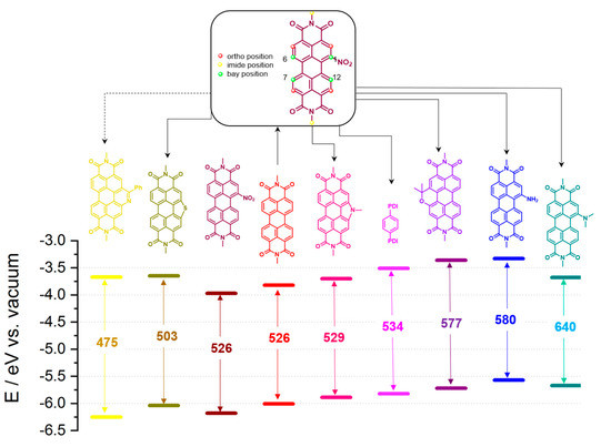 1-NitroPDI, a key intermediate for reaching various bay-substituted-PDI structures with distinct photoredox properties. Frontier orbital energy (HOMO-LUMO) levels of PDIs. Wavelengths (nm) of maximal absorption of light are shown. The data were collected from references [30,31,32,33,34,35].
