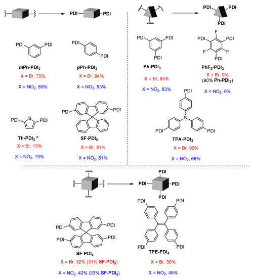 Besides, over the last decade, PDI-based multimers have received as much attention as NFAs in organic photovoltaics (OPV) owing to their three-dimensional structure preventing the formation of aggregates and in this respect enhancing the performance of OSCs. In our group, we developed conditions of multimerization through poly-SMC using an aromatic linker with multiple boronic acids or esters and 1-nitroPDI or 1-bromoPDI as electrophilic partners [33]. The described methodology employed Pd(PPh3)4 as the Pd(0) source with K2CO3 in a dioxane/water mixture under microwave irradiations, affording various dimers, trimers and tetramers (Scheme 7 and Figure 2). In general, the yields are comparable, starting from nitro 5 and bromo 3 PDI derivatives, and are notably good for the phenylene (Ph) series (over 90% per coupling from 1-nitroPDI).