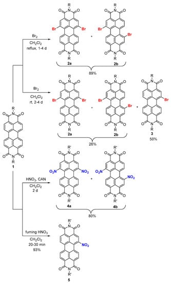 Nitration or halogenation, and more specifically chlorination or bromination, on the perylene core through electrophilic substitution (SEAr) affords key building blocks for further functionalization of PDI derivatives. Such a reaction enables the decoration of the bay positions with respect to Holleman rules, according to the electron withdrawing character of the diimide groups. Historically, the tetra-chlorination of PDIs has enabled the emergence of wide applications by increasing solubility in organic solvents with a significant twisting of the perylene core and the possibility to tune their electronic properties [36]. In this review, we are focusing on the bis, and essentially, the mono-bay-functionalization of PDIs, which limit the twisting of the perylene. To do so, the most popular method is the introduction of bromine atom(s), which can subsequently be replaced through nucleophilic substitution or pallado-catalyzed organometallic coupling reactions. We are herein highlighting that the (mono) nitration of PDI should be considered as an excellent alternative to the (mono)bromination.