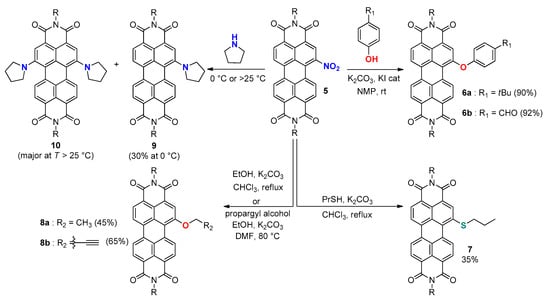 Thanks to the strong electron-withdrawing character of nitro group, nucleophilic substitution reactions can be easily achieved from 1-nitroPDI 5 (Scheme 2). X. Kong et al. described smooth substitutions of 1-nitroPDI with phenol derivatives, ethanol, propanethiol and pyrrolidine as nucleophiles [55]. When stirring at room temperature with 4-tertbutylphenol in the presence of K2CO3 and a catalytic amount of KI in NMP, the reaction afforded the desired product 6a in 90% yield. The reaction can occur in DMF or CHCl3 in lower yields (less than 65%). Similar conditions were also described to replace the nitro group by electron poor phenoxy and aliphatic ether and thioether in CHCl3 or DMF [48,49], which required higher temperature when using aliphatic thiol or alcohol. Remarkably, stirring 1-nitroPDI in neat pyrrolidine at 0 °C already promoted the nucleophilic substitution to give 9 in 30% yield, which highlights the high reactivity of the nitro group toward SNAr [55]. Nevertheless, when the reaction was carried out above 25 °C, the major product surprisingly formed was 1,6-disubstituted PDI 10 without any further discussion from the authors justifying the presence of this side product.