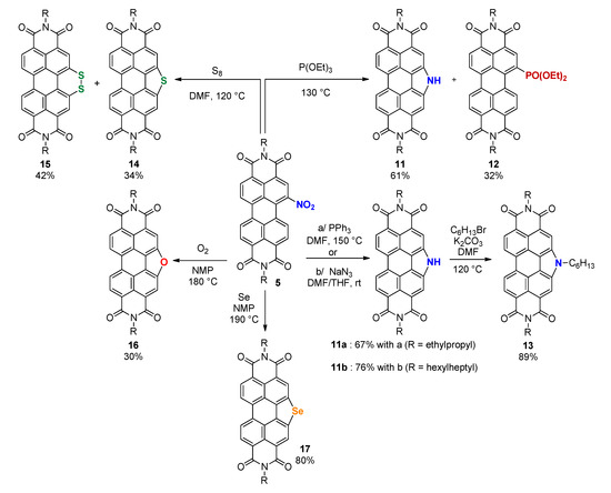 The incorporation of annulated-heteroatoms such as S [56], Se [46], or N [50], in the bay positions of the PDI core is recognized to be one of the most effective method to decrease its electron affinity as well as to reduce the intermolecular aggregation between PDI units [57]. In this respect, important research effort has focused on the synthesis of heteroatom-annulated PDIs for the elaboration of high performance organic semiconductors and organic solar cells. To the best of our knowledge, 1-nitroPDI 5 is the most convenient starting material to reach those structures.