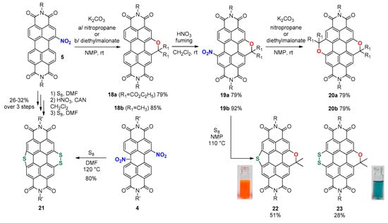 Following the same sequential synthesis, S-annulated PDIs 14 and 15 were nitrated and bis-bridged, affording unsymmetrical S-PDI-2S 21 in both cases in 76% yield over two steps [60]. In the same work, a one-pot synthesis of the same product was also reported from a mixture of 1,6 and 1,7-dinitro-PDIs 4 in 80% yield. In addition, the S and O-doping strategies were mixed, and in this respect, 7-nitro-pyran-fused PDI 19b was S-annulated in the presence of sulfur powder yielding to the mixture of two sulfur- and oxygen-containing heterocycle PDIs 22 and 23. Notably, the two derivatives display very different optical properties, as depicted in the pictures in Scheme 4 [62].
