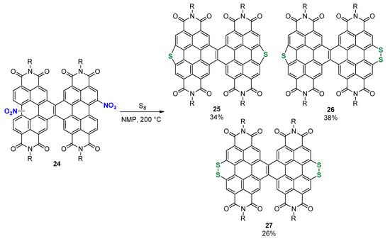 Finally, the bis-sulfur-annulation was applied to a fused-PDI dimer 24 through nitration of the parent dimer (Scheme 5) [63]. The reaction with sulfur powder in refluxing NMP afforded a mixture of multisulfur-fused-PDIs 25, 26 and 27.