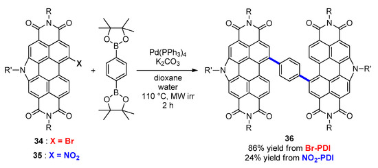 The bay-decoration of PDI through the formation of C-C bond has been widely employed in organic electronics, such as for the elaboration of OSCs using donor-acceptor (D-A) systems or PDI-based NFAs. The synthetic methodology usually followed is the bromination of PDI in bay position and subsequent Pd-catalyzed cross-coupling reaction. However, as already discussed, the monobromination of PDI suffers from many disadvantages compared to the mononitration (see Section 2).