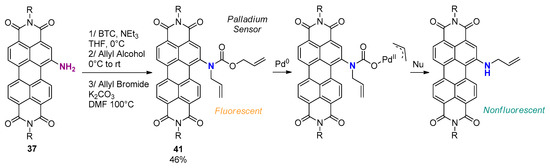 Treatment with bis(trichloromethyl) carbonate (BTC) in the presence of triethylamine in THF followed by the reaction with allyl alcohol led to the formation of the fluorescent mono-carboxylated amino intermediate (Scheme 11). The latter was further alkylated with allyl bromide to afford a colorimetric and fluorescent sensor for Pd2+ detection in 46% yield [71]. In the presence of Pd0, decarboxylation of compound 41 led to the formation of a non-fluorescent species, which also shows its absorption maximum shifting toward longer wavelength.