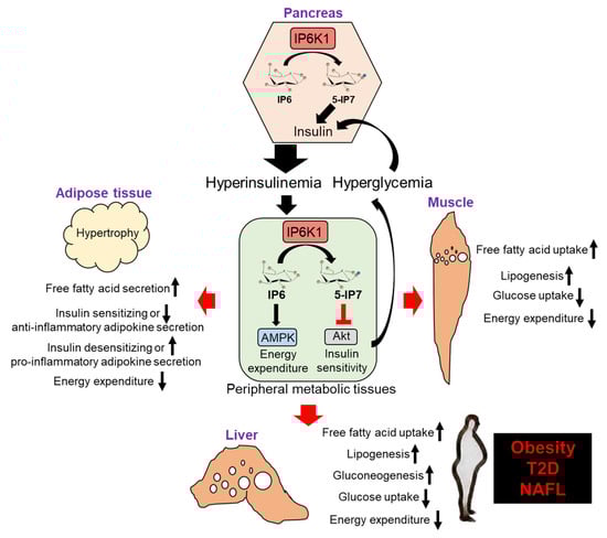 How does IP6K1 mediated enhancement in insulin secretion and inhibition in insulin signaling fit in the context of metabolic diseases? Under normal conditions, insulin stimulates Akt mediated phosphorylation of FoxO1 to reduce gluconeogenesis [185], and activates the transcription factor SREBP1c to enhance de novo lipogenesis [186]. Obesity, T2D and NAFLD patients exhibit the classic triad of hyperinsulinemia, hyperglycemia and hypertriglyceridemia [187]. Hyperglycemia induces hyperinsulinemia. In this condition, the Akt-FoxO1 axis becomes insulin resistant, whereas the SREBP1c axis maintains insulin sensitivity. Consequently, uncontrolled gluconeogenesis and lipogenesis occur, leading to hypertriglyceridemia. These aberrations concomitantly cause systemic insulin resistance and metabolic dysfunction by affecting adipose tissue and muscle [187].