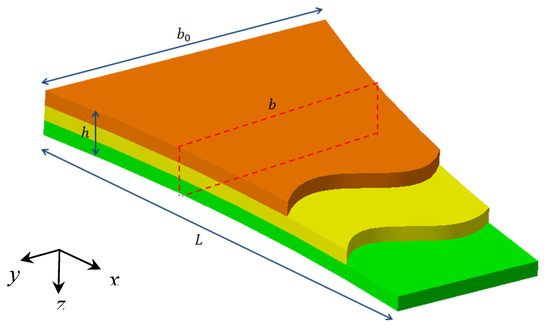 Let us consider the orthotropic non-uniform nanobeam in Figure 1, with length , constant thickness , variable width , in a Cartesian coordinate system (x,y,z).
