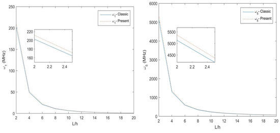 Table 3 and Table 4 illustrate the main results in terms of natural frequency for different size ratios, , non-uniformity parameter, , length scale, l, for a S-S and C-F non-uniform nanobeam, respectively. Based on these tables, an increased length scale and a decreased size ratio leads to an overall increase of the natural frequencies. A non-monotonic behavior, instead, is exhibited by the natural frequencies for an increasing non-uniformity , while keeping fixed the other parameters. In Figure 2, we plot the variation of the first and the fifth natural frequencies for a three-layer [90°,0°,90°] Euler-Bernoulli S-S non-uniform beam with size ratio , and fixed values of h = 10 nm, b0 = 2 h, Nh = 0.5. The NMCST under the assumption of l = 1 nm is here compared to the classical approach (i.e., for l = 0 nm). As clearly shown in Figure 2, the classical theory predicts lower values of natural frequencies with respect to the NMCST here proposed, whereby, both natural frequencies () decrease for increased geometrical lengths of nanobeams. The parametric study is thus repeated for a C-F nanobeam, whose results are plotted in Figure 3 in terms of the natural frequencies , while assuming the same geometrical and mechanical parameters as in the previous investigation. Additionally, in this case, the NMCST yields higher values of natural frequencies compared to a classical approach. The main difference between the two approaches, in this case, is less pronounced because of the lower deformability of the C-F nanobeam compared to a S-S boundary condition.