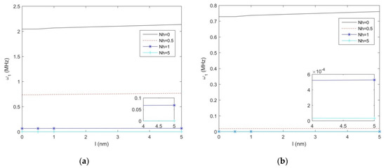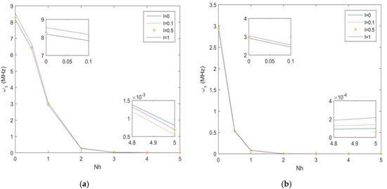In Figure 4a,b, we plot the first natural frequency vs. the non-uniformity parameter , for the S-S and C-F non-uniform nanobeam, along with different length scale parameters, namely, l = 0; 0.1; 0.5; 1, and a fixed geometry h = 10 nm, b0 = 2h, L/h = 10. As shown in Figure 4, for both sets of boundary conditions, the natural frequency decreases with an increased non-uniformity parameter (see the zoom-ups of Figure 4). Moreover, the natural frequency decreases monotonically between Nh = 0 and Nh = 3 or 2, depending on the selected boundary condition, with a drastic reduction up to a null asymptotic value. A monotone increase of the natural frequency is also observed for an increasing length scale parameter l, at least for lower values of , whose variation is finally visualized in Figure 5a,b, for a S-S- and C-F nanostructure, respectively. Based on the last results, it seems that uniform beams are more sensitive to the length parameter, compared to tapered geometries, which could be accounted for design purposes of nanodevises.