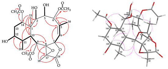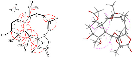 Coupling constants information in the COSY spectrum of 2 enabled identification of H-6/H-7, H-9/H-10/H-11/H-12/H2-13/H-14, H-11/H3-20, and H-6/H3-16 (by allylic coupling; Figure 3), these data, together with the HMBC experiment (Figure 3), the molecular framework of 2 could be established. The HMBC also indicated that the acetoxy groups should be attached at C-4, C-9, and C-14, respectively. Thus, the remaining hydroxy groups have to be positioned at C-2, C-3, and C-12, as indicated by the COSY correlations between H-2/OH-2, H-3/OH-3, and H-12/OH-12.