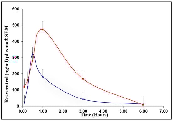 Plasma resveratrol (RSV) concentration (ng/mL)–time curve in mice (n = 3) treated with RSV (blue line) or resveratrol nanoformulation (NP-RSV) (red line) at 4 mg/kg.