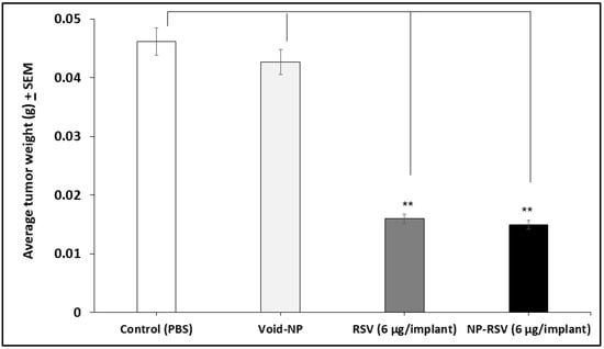 Resveratrol (RSV) and its nanoformulation (NP-RSV) reduced subcutaneous COLO205-luc tumor weight. Four implants/mouse subcutaneously, 3 animals per group. ** P < 0.01.