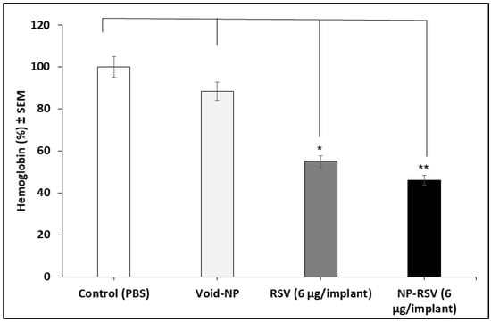 Resveratrol (RSV) and its nanoformulation (NP-RSV) reduced subcutaneous COLO205-luc tumor hemoglobin percentages. Four implants/mouse subcutaneously, in each of the 3 animals per group. * P < 0.05; ** P < 0.01.