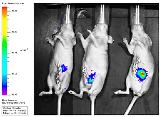 Representative IVIS images of mice with orthotopic implants of COLO205-luc after 3 days of implantation in cecum.