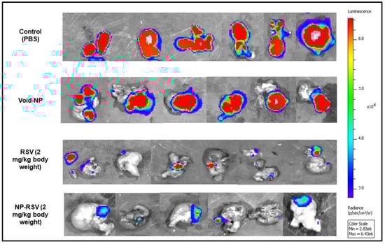 IVIS images (ex vivo) of the orthotopic COLO205-luc tumors after 3 weeks of treatment with resveratrol (RSV) and its nanoformulation (NP-RSV). High signal intensity, red color areas indicate increased viability of cancer cells, while blue color areas indicate the lowest viability or necrosis. A light blue to green color indicates low viability.