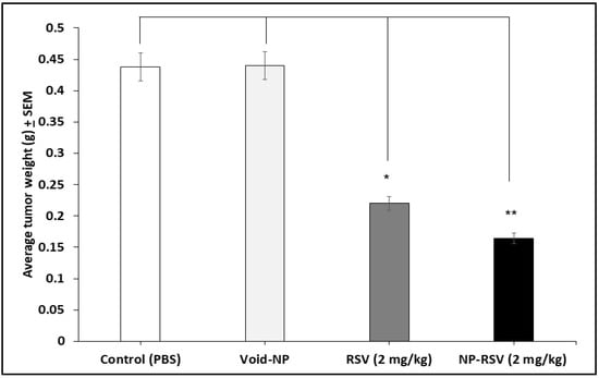Resveratrol (RSV) and its nanoformulation (NP-RSV) reduced the weight of orthotopic colon tumor (COLO205-luc). * P < 0.05; ** P < 0.01.