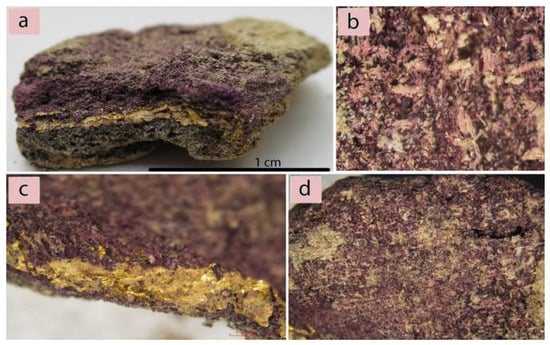(a) The analyzed sample; (b) Mineralized structure of a textile with purple dye remains; (c) Purple dye and gold strip evidence; (d) A purple area on the surface of the sample.