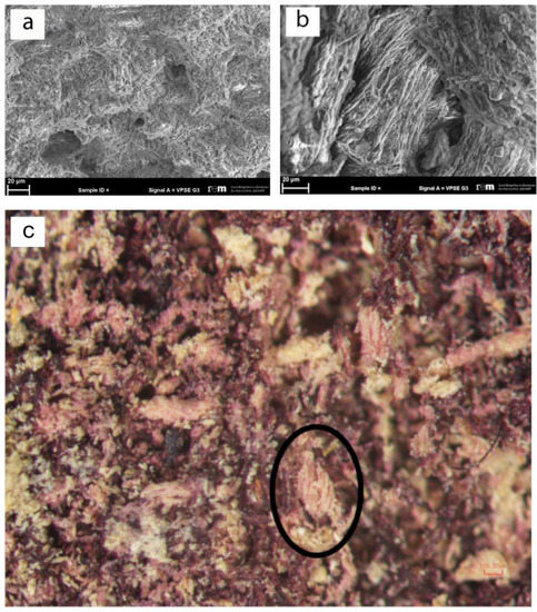 (a) SEM evidence of alteration of morphology of the sample’s fibers; (b) Presence of crystals with characteristic gypsum structures on altered fibers; (c) Stereo microscope image evidencing the z-twist feature (black circle).
