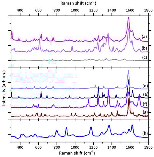 Raman and SERS spectra: results and literature references. Top panel: (a) the Raman spectrum acquired on the colored area of the archeological sample and (b) the SERS spectrum of the DMF extract from the sample; (c) the SERS spectrum of DMF is displayed for reference. Central panel: (d) Raman reference spectra of 6-monobromoindigotin (ref. [36], excitation laser line: 785 nm); (e) 6,6’-dibromoindigotin (ref. [35], excitation laser line: 633 nm); (f) indigotin (ref. [35], excitation laser line: 633 nm); (g) indirubin (ref. [40], excitation laser line: 532 nm). Bottom panel: (h) the SERS reference spectrum of the DMF extract of indigo acquired using the Lee–Meisel Ag colloid as a SERS substrate [39].