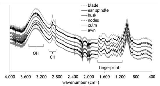 Infrared spectra of different plant parts of wheat straw (8 repl. each). Spectra are shifted on the vertical axis; legend sequence corresponds to the shifted spectra sequence. Broad bands of OH and CH functional groups are indicated, as well as the fingerprint region.