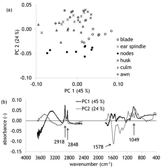 To evaluate even smaller differences Principal Component Analysis (PCA) has been performed; the results are presented in Figure 2. Figure 2a displays in the scores plot the different plant parts arranged according to their chemical fingerprints. In Principal Component (PC) 1 especially blades are shifted to the right. PC 2 separates the nodes to the bottom and husks, ear spindles, and awns to the upper part. Figure 2b presents the loadings plots that explain the pattern visible in the scores plot. PC 1 is dominated by the methyl and methylene bands (2918 and 2848 cm−1) as already visible in Figure 1. Additionally, a maximum at 1049 cm−1 is visible that can be assigned to the valence vibration of C-O mainly from C3-O3H [19] found especially in cellulose. PC 2 is dominated by a minimum at 1578 cm−1 assigned to the aromatic ring of lignin [14]. Variability within the different plant parts was found to be smaller than between them.