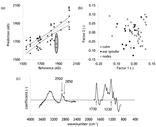 Due to the limited number of objects spectra of all plant parts were combined in a data set for a preparatory model to predict the age of a sample out of its spectral pattern. Results of the Partial Least Squares (PLS) regression are found in Figure 3. The model establishes a coefficient of determination for the validation of 62.2%. The root mean squared error amounts to 93 years. This value refers to a single sample. For practical purposes, an object could be samples with replicates as well. These replicates will narrow the prediction interval of the estimation of object’s age. Figure 3b displays the scores of the first two factors. It becomes obvious that the different plant parts behave slightly different. This variability is part of the overall model variability. The loadings plot in Figure 3c shows which spectral regions are most relevant for the model prediction. They indicate which molecular groups dominate the aging effects that are used for our model. Dominant maxima are found at the 1730 cm−1 and 1230 cm−1. These two bands already have been found to be the most important ones in the taphonomy of wood and bark in a prehistoric salt mine in Hallstatt, Upper Austria. They were assigned to acetyl groups of hemicelluloses [8,9]. Acetyl groups can be seen as one of the weakest parts of the molecules. For wood, the deterioration of this molecular group during aging has been observed a number of times [8,11,13,21,22]. Methylene groups (band maxima 2920 and 2850 cm−1) play only a subordinate role in the molecular changes over time. This group is commonly affected by biological degradation of organic matter [23].