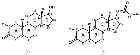 Chemical configurations of (a) drostanolone and (b) drostanolone propionate displaying the atom labeling system.