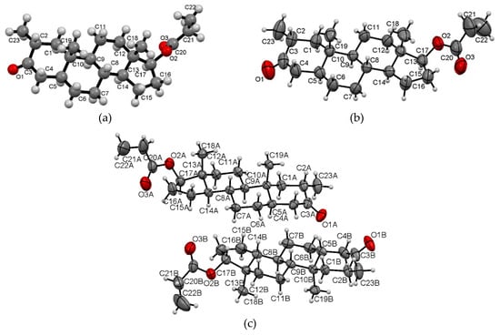 The polymorphism in organic compounds is the ability to exist in several crystalline forms. The polymorphs have similar chemical content but exhibit different crystal packing and arrangement [1]. Androgens represent a class of compounds, which can be synthetic or naturally found in vertebrates that are responsible for development and maintenance of male characteristics. The anabolic component of a certain anabolic-androgenic steroid is related to increased protein synthesis in muscle tissues and bones, while the androgenic component is responsible for the development of secondary male characteristics such as deepening of the voice, facial and body hair growth, and aggressiveness. Synthetic androgens are chemically-modified forms of the primary male hormone, testosterone, with the purpose to lower the androgenic characteristics and increase the anabolic properties [2]. Despite the fact that anabolic-androgenic steroids fulfill certain functions in vertebrates and are very effective to boost sports performance, their misuse and abuse can lead to undesirable, serious negative side effects on health. Heart diseases (hypertension, left ventricular hypertrophy, impaired diastolic filling, polycythemia, and thrombosis) are known to be related to the long-term consumption of anabolic steroids [3]. A decrease in the high density lipoprotein (HDL), concomitant with an increase in a low density lipoprotein (LDL) and total cholesterol, are related to the consumption as well, which may increase the risk of atherosclerosis in the coronary arteries [4,5,6]. Hypogonadism induced by anabolic steroids in males and the development of male characteristics in women and children are regarded as having milder side effects and they are reversible to some extent [7]. Besides the anabolic properties of the derivatives in this group, they can be useful in certain medical conditions, which cause undesired catabolism and loss of muscle mass. They act as anti-catabolic, which negates the effects of cortisol and the derivatives from glucocorticoids class [7,8].