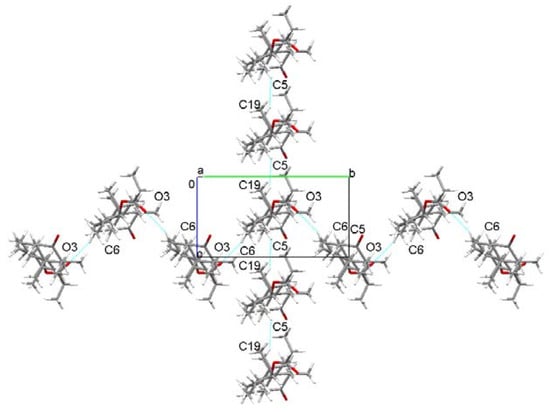 The unit cell of Drost 2 contains two molecules related by a 21 screw axis linked by C5-H...H-C12 short contact, formed between C5 carbon, which belongs to both A and B steroid rings and C12 carbon of the C ring. The pattern is further extended by translations and forms an arrangement parallel to the ob direction. At the same time, along the c-axis, an infinite arrangement of molecules is formed, which are linked between O3 carbonyl oxygen and C19 methyl group by C19-H...O3 hydrogen bond, as shown in Figure 4.