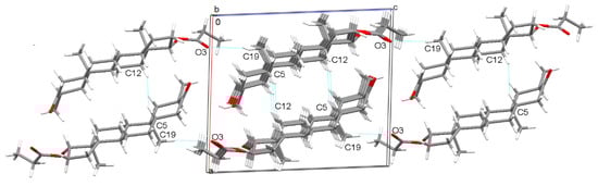 Figure 3 presents the molecular packing of Drost 1, viewed along the a-axis direction. The molecules of Drost 1 are linked by C6-H...O3 contacts formed between the carbonyl O3 oxygen and C6 carbon belonging to the B steroid ring and are building molecular sinusoidal chains in the direction of the b-axis. Along the c-axis, the molecules are linked by C5-H...H-C19 short contacts formed between C5 carbon, which belongs both to A and B rings toward the C19 methyl group. This pattern is repeating by translations equal to lattice parameters both along the c-axis and b-axis.