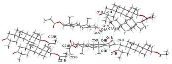 The unit cell of Drost 3 fits eight drostanolone propionate molecules. The two independent molecules in the asymmetric unit of Drost 3 are held by bifurcated C5B-H...O1A and C1B-H...O1A hydrogen bonds between the carbonyl O1A oxygen with C1B and C5B carbon atoms of the A ring in molecule B. The C4A-H…O1B hydrogen bond links the C4A carbon of molecule A with the carbonyl O1B oxygen. Within the structure, the B molecules are held together by a combination of C4B-H…O1B between C4B carbon of the ring A with the oxygen O1B and the C21B-H…H-C22B short contact interaction extended between C21B and C22B carbons of the propionate ester (Figure 5). Mercury software [16] was used to generate perspective molecular views and the packing diagrams.