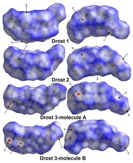 Front views and back views of the three-dimensional Hirshfeld surfaces (mapped with dnorm) for studied drostanolone propionate structures are given in Figure 7. The contacts mapped in red represent the interactions with the distances between atoms smaller than the sum of van der Waals radii, white areas highlight intermolecular contacts close to the sum of van der Waals radii, and blue is used for longer contacts [25]. The Hirshfeld surfaces were mapped with dnorm between −0.151 (red) and 1.628 (blue). Figure 7 shows the Hirshfeld surfaces’ front views, respectively, back views of each polymorph, and intermolecular interactions smaller than the sum of van der Waals radii showed as labelled arrows. Each label illustrated on the Hirshfeld surface has the interaction geometry detailed in Table 3.