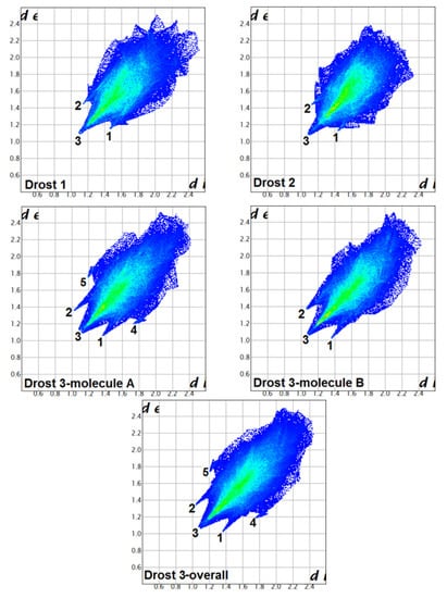 - The top end values of de and di in the fingerprint plots of Drost 2 are slightly smaller in comparison with Drost 1 and the two independent molecules of Drost 3, which conclude that Drost 2 has higher packing efficiency [26]. This is already in good agreement with the Kitaigorodskii packing index.