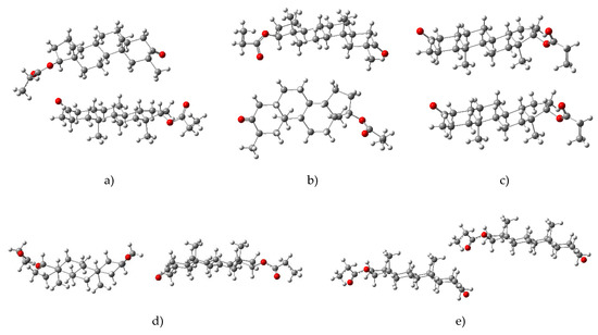 The maximal torsional parameter, τm (Table 8), in the studied compounds, was found to be relatively constant and close to 47°, which is a common value found in all D steroid rings [53] and other androstane derivatives [54]. Overlapping Drost 1, Drost 2, and the two molecules in the corresponding asymmetric unit of Drost 3, it is observed that A, B, C, and D rings overlap quite well, while the largest differences are observed in the propanoic acid terminals (Figure 11).